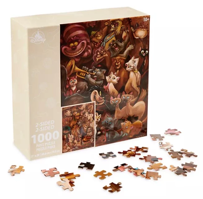 No need to decide if you’re a cat person or a dog person when you assemble this two-sided 1,000 piece jigsaw puzzle with art by Darren Wilson. One side features a clowder of Disney Cats while the reverse stars a pack of Disney Dogs.