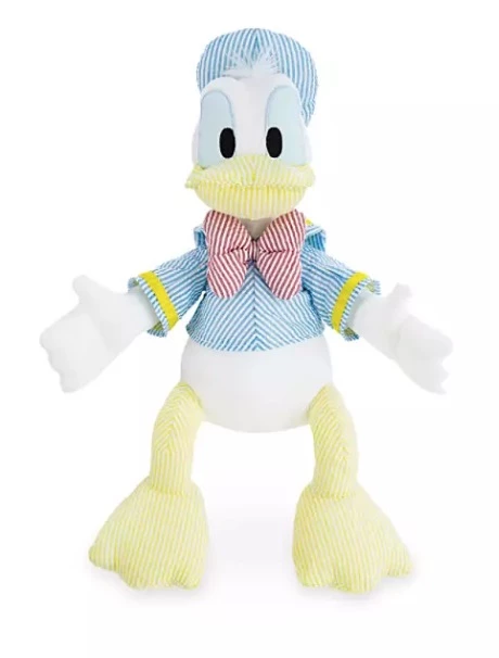 Seersucker, or railroad stripe, is a traditional fabric weave often used in suits and shirts — and now for designer Disney plush! Our Donald Duck soft toy is finely sculpted in puckered, wrinkly, seersucker striped material for a classic look that collectors will love!